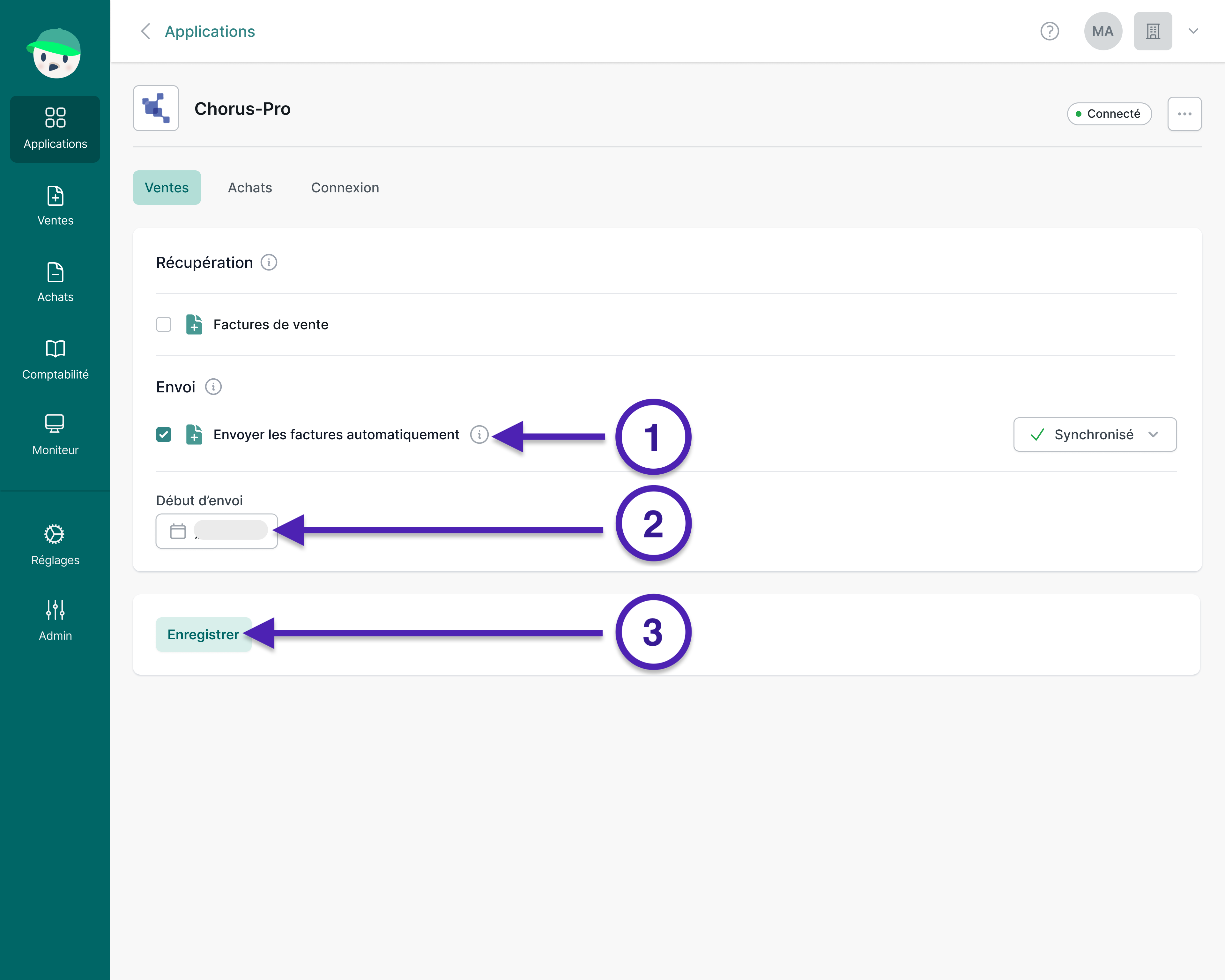 Il est possible d’activer l’option Envoyer automatiquement les factures sur Chorus Pro afin que les factures soient envoyées directement sans validation dès qu’elles sont récupérées.