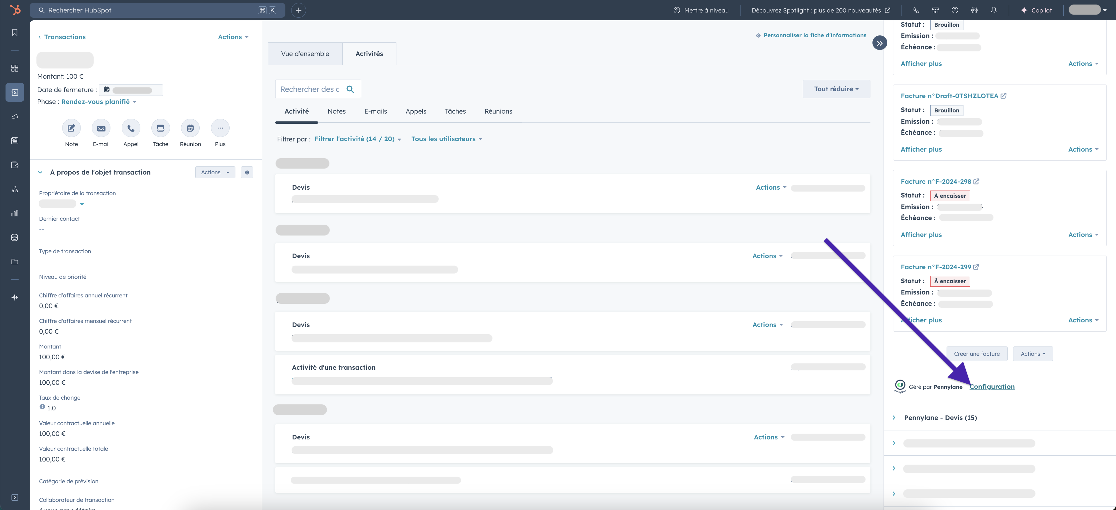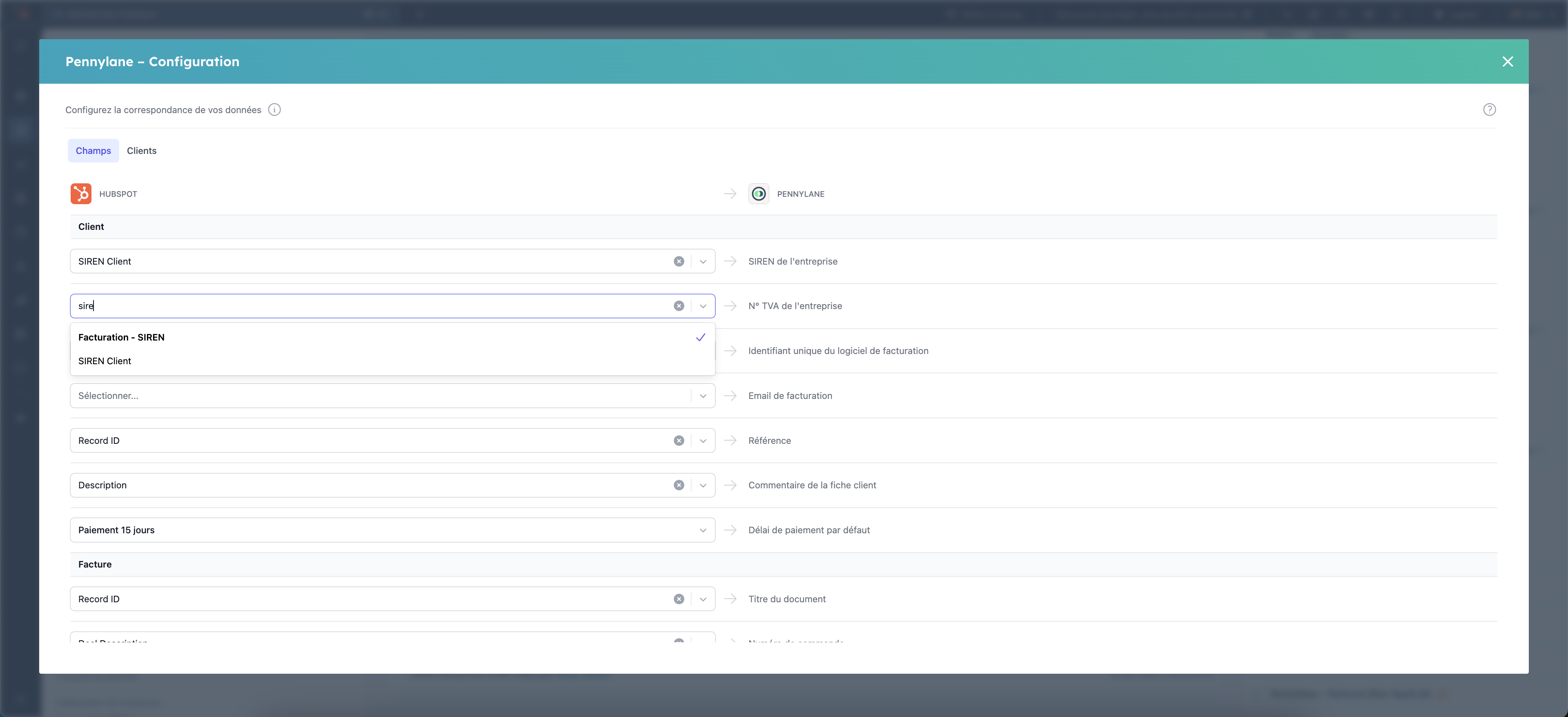 Afin que toutes les données soient synchronisées entre HubSpot et Pennylane, il est possible de configurer la correspondance des champs entre les 2 applications.