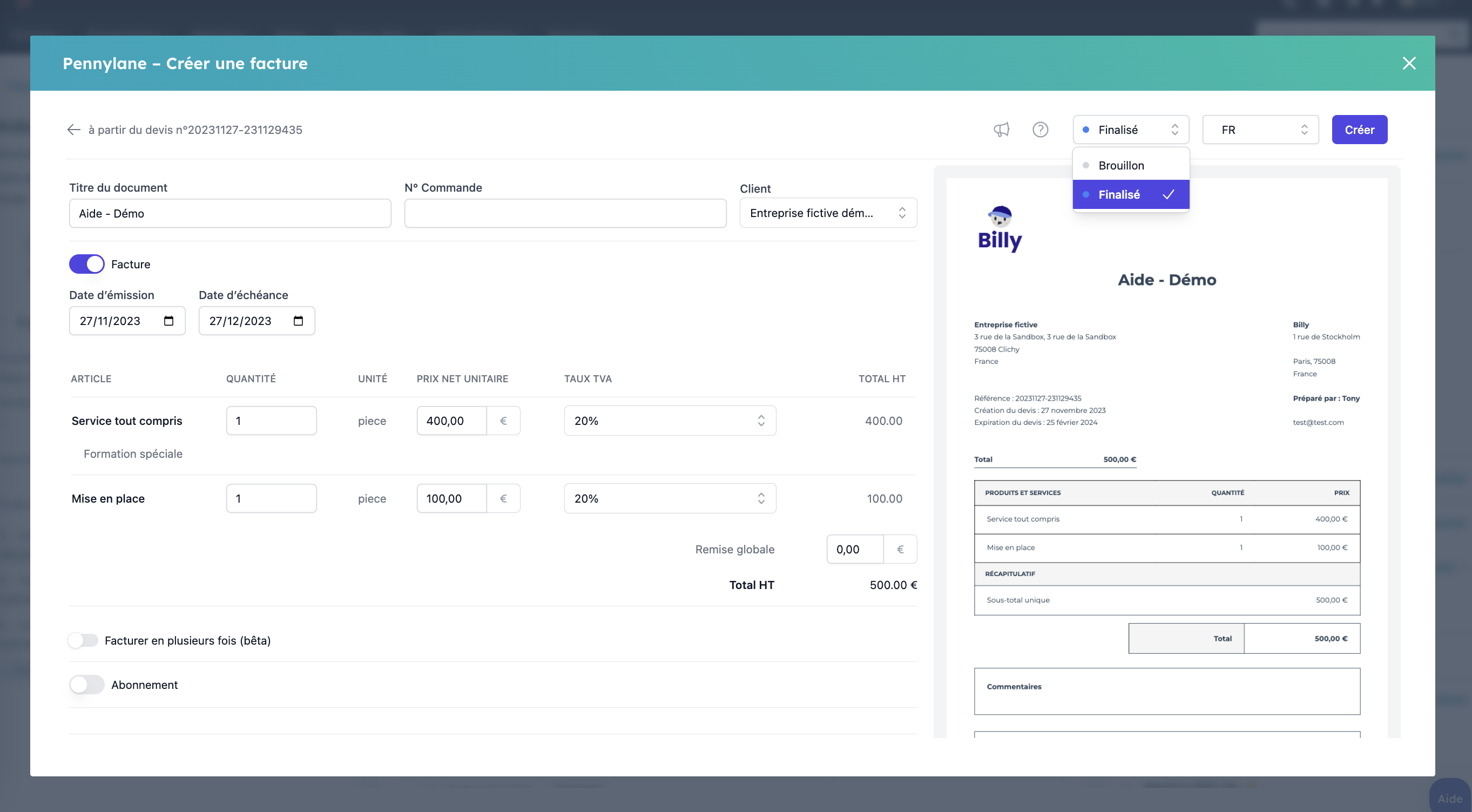 Choisir le mode de facturation : “Brouillon“ ou “Facture finale“