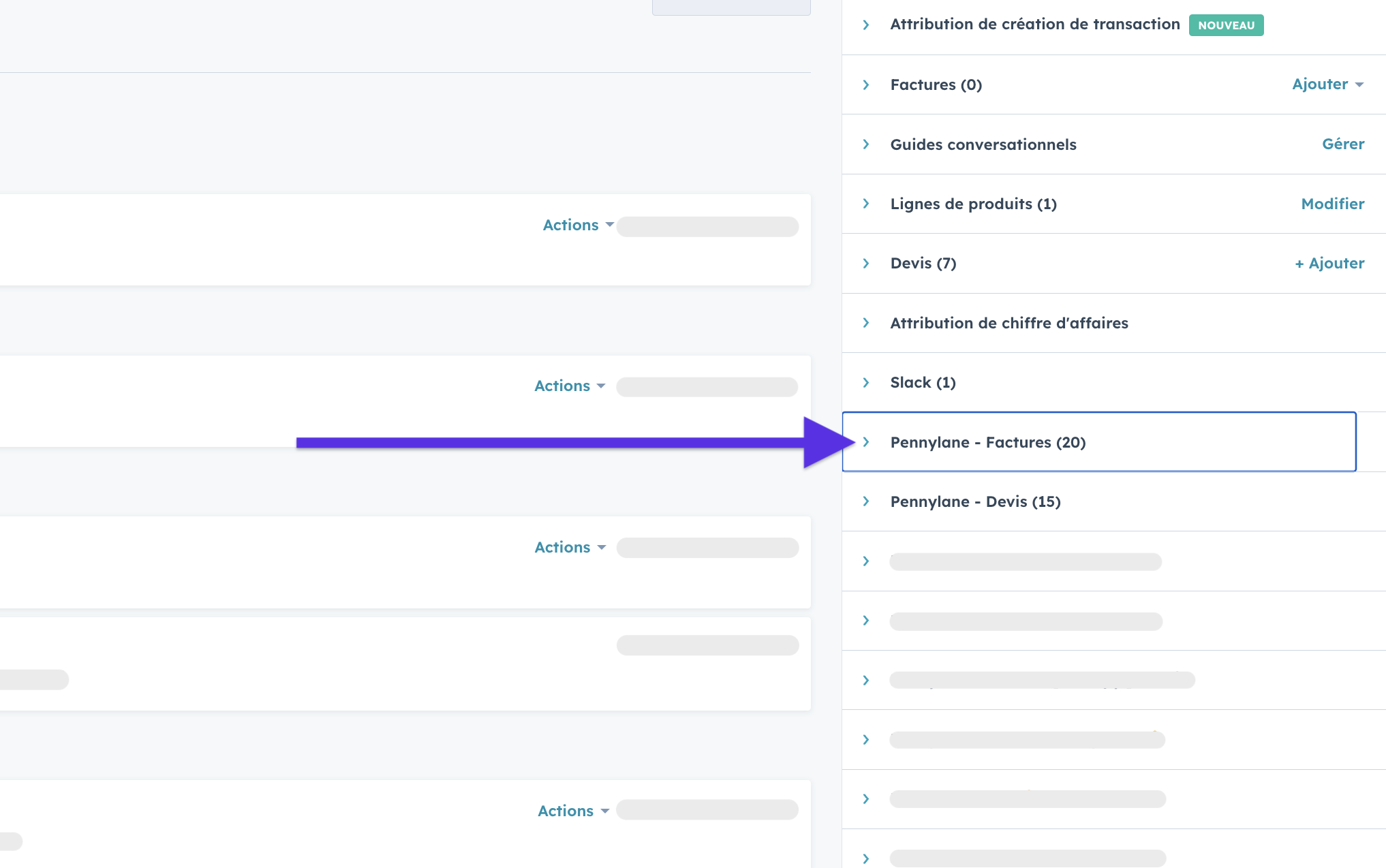 Faire défiler le menu de droite et sélectionner la section “Pennylane - Factures“