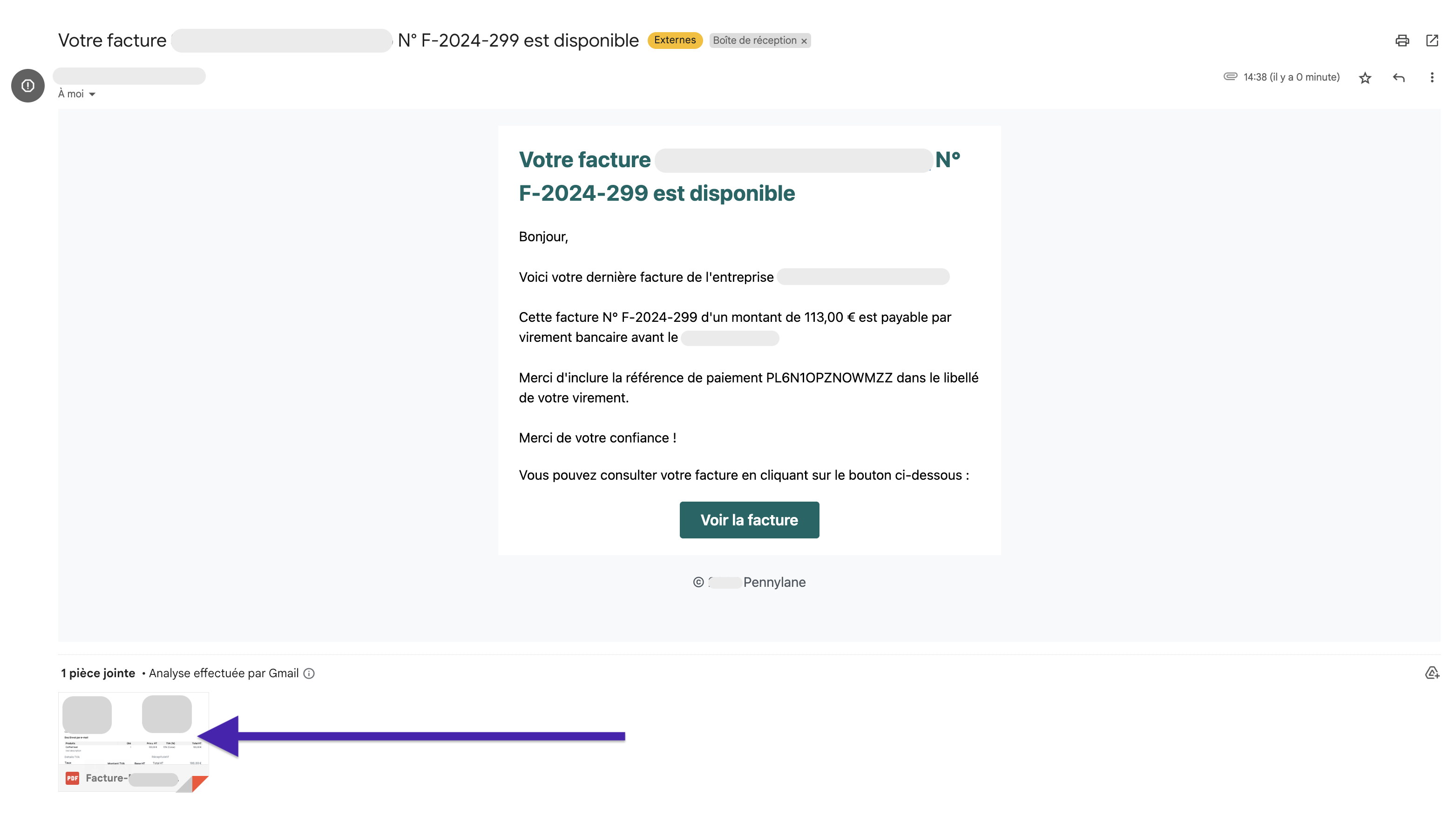 Le destinataire reçoit un e-mail avec la facture en pièce-jointe.