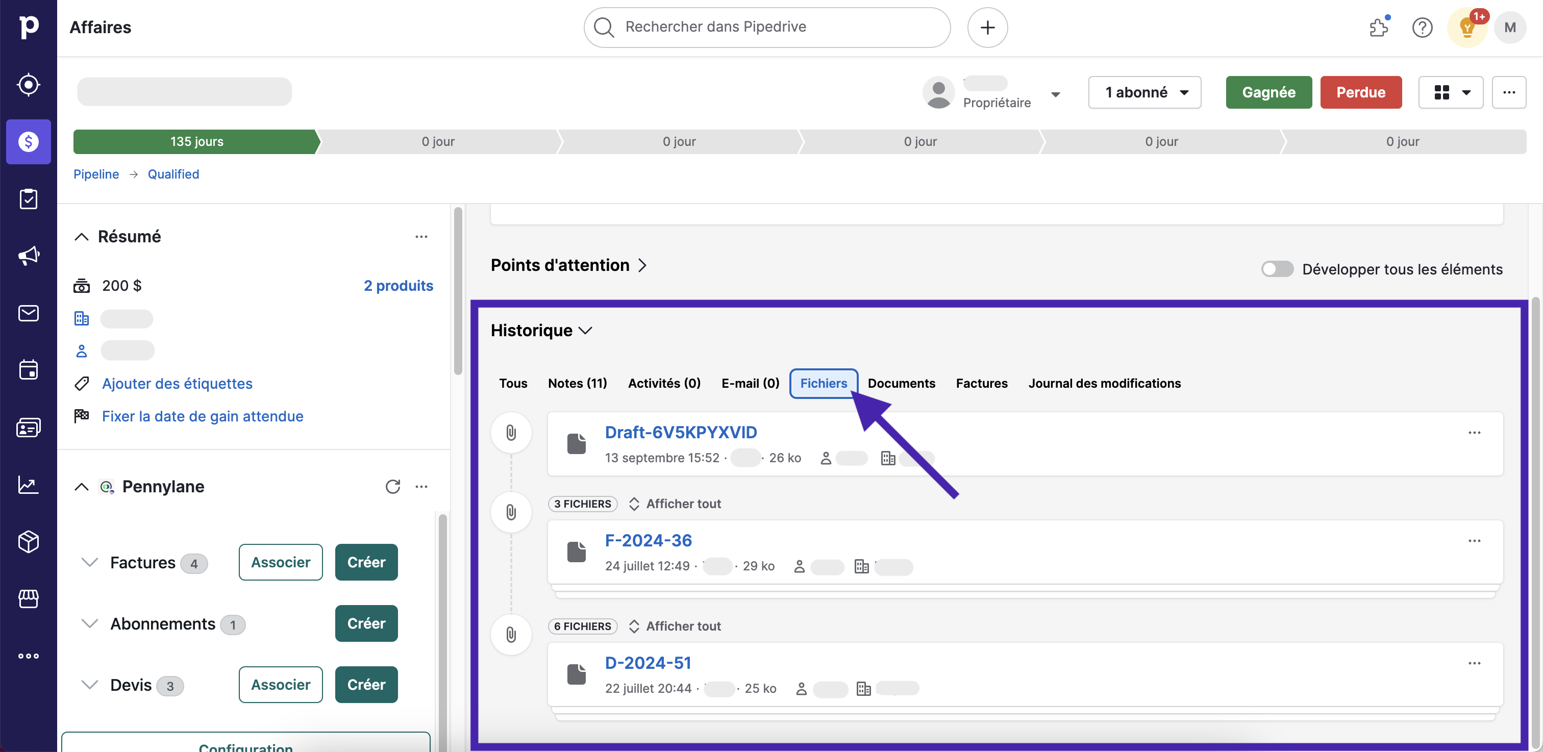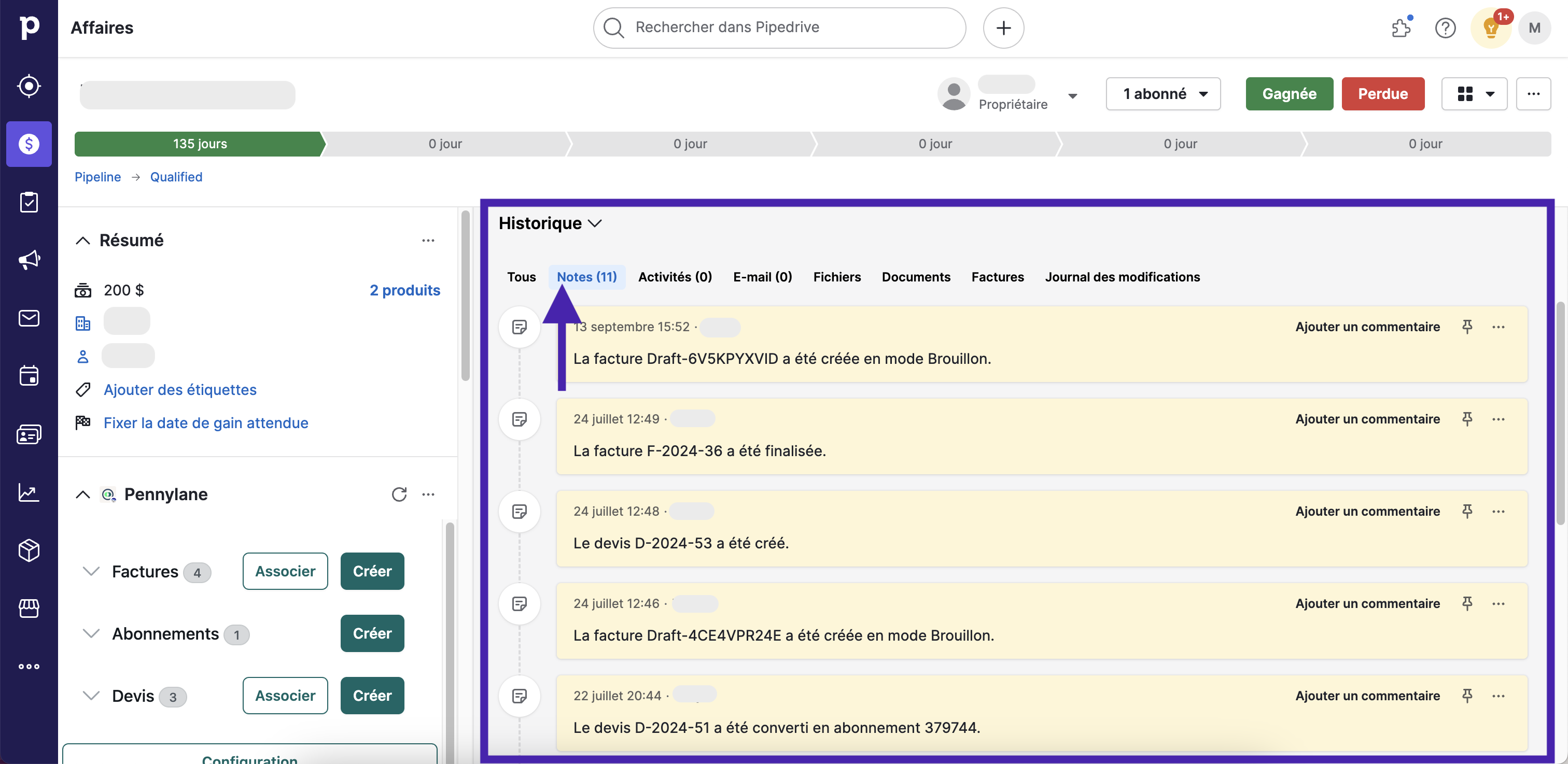 Page d'une Affaire Pipedrive
