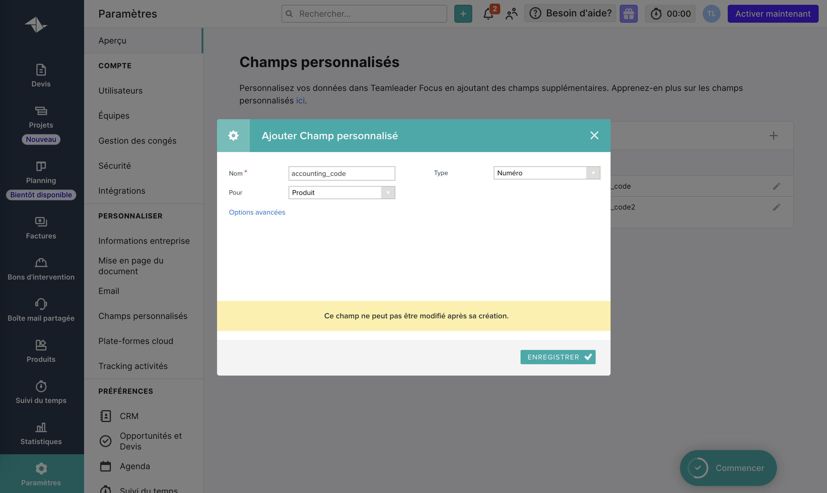 Indiquer le compte comptable souhaité dans le champ créé