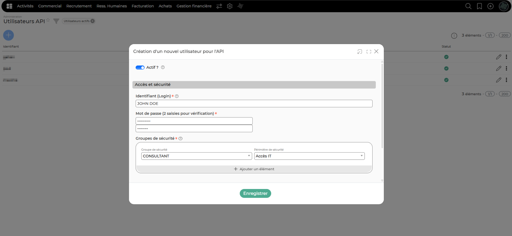 Fenêtre Création d'un nouvel utilisateur pour l'API