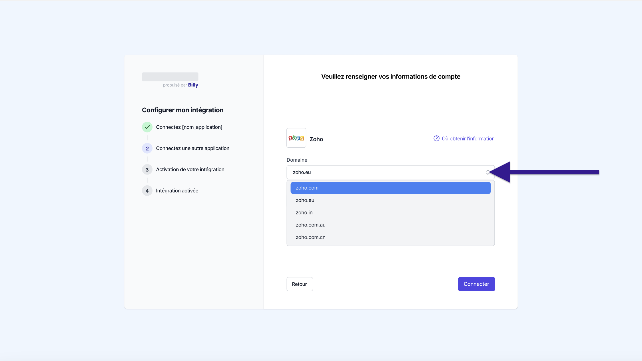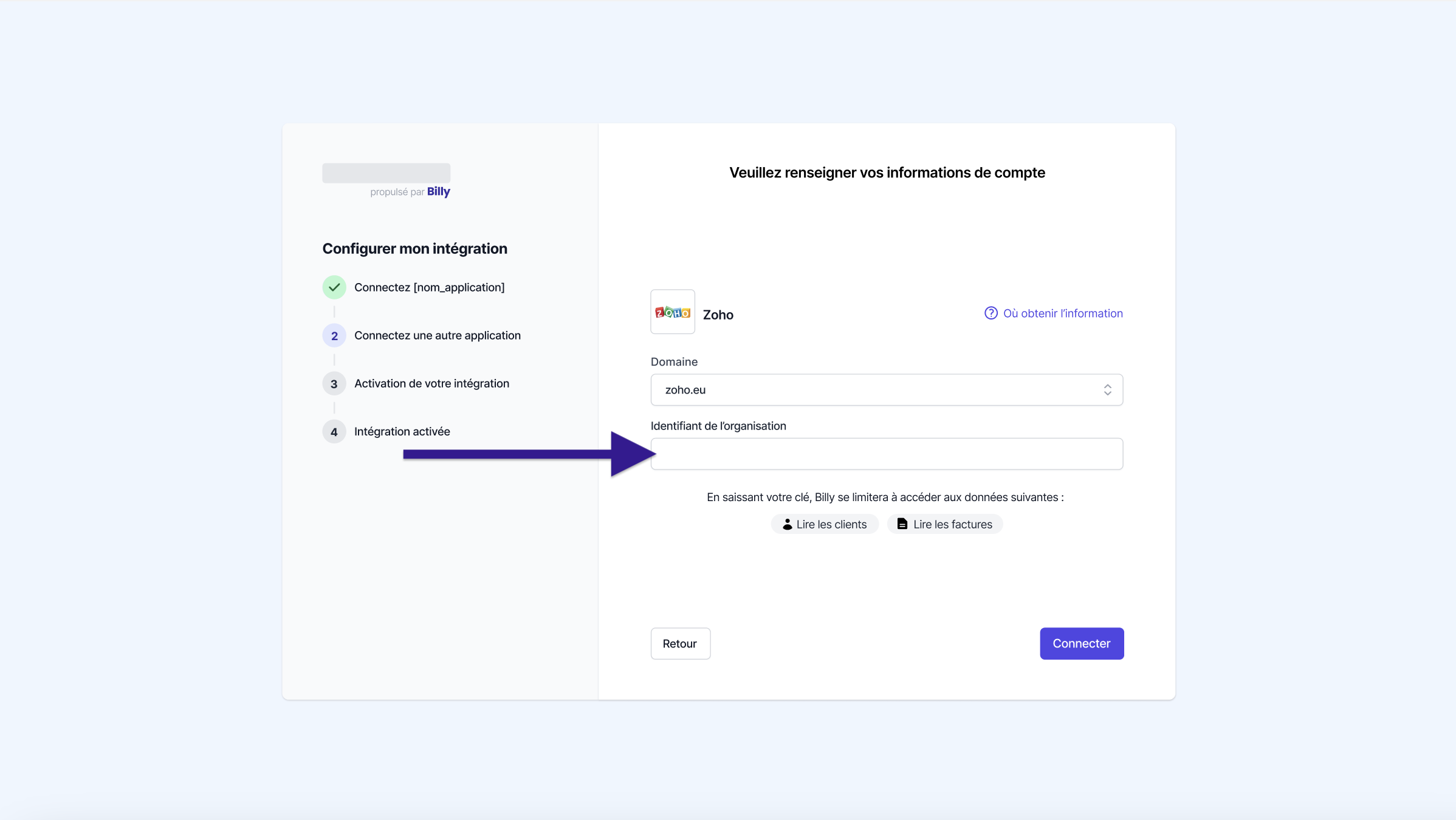 La procédure consiste à récupérer l’identifiant de l’organisation et le nom de domaine sur Zoho puis de les coller.Temps nécessaire : ± 3 minutes