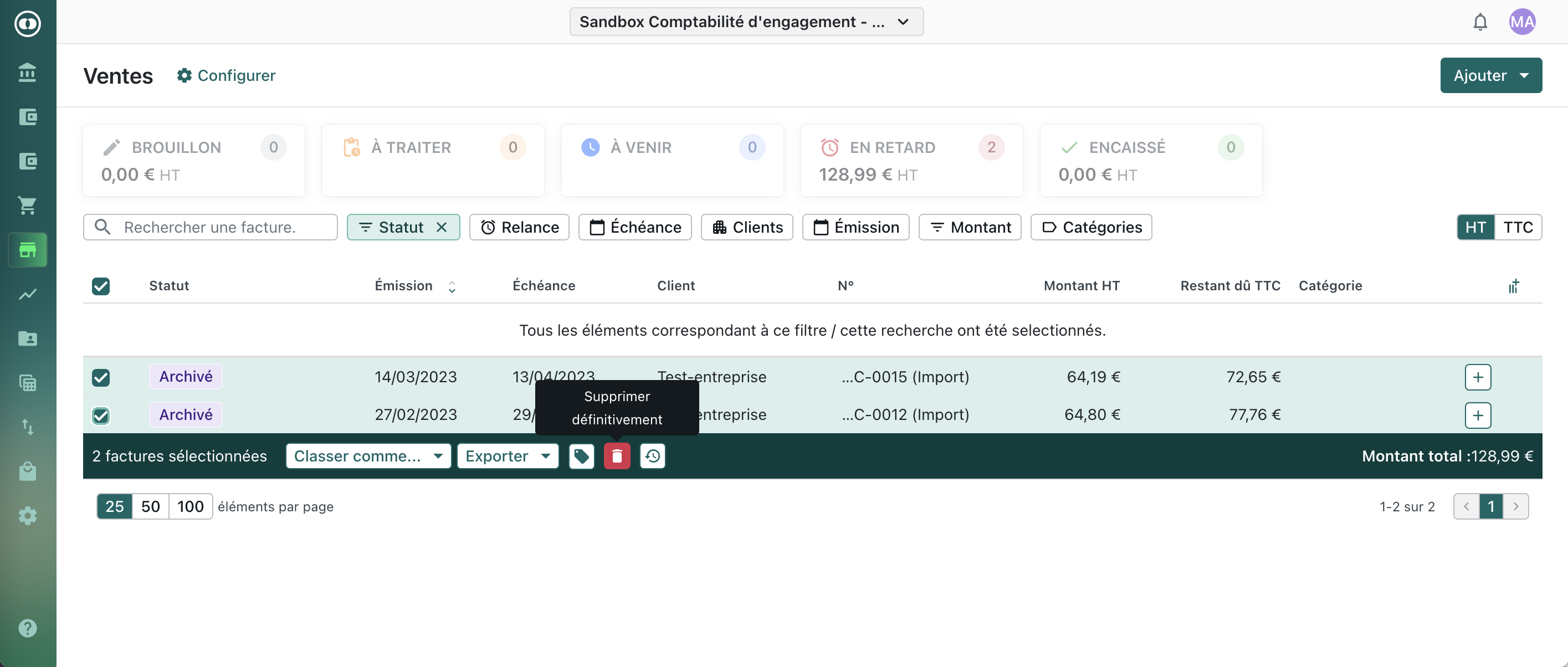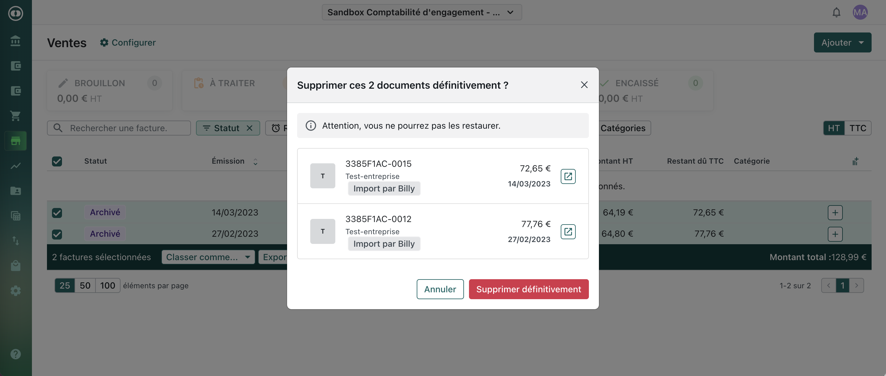 Sélectionner les factures archivées à supprimer en cochant les cases correspondantes à gauche